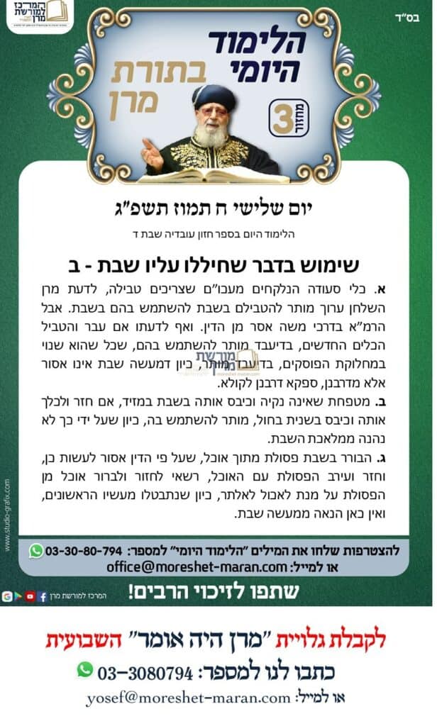 הלימוד היומי בתורת מרן | יום שלישי ט"ו תמוז ה'תשפ"ג