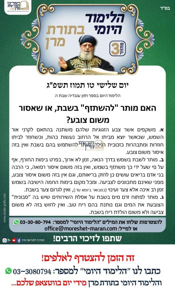 המליצו למשפחה ולחברים להצטרף ללימוד היומי בתורתו של מרן! *להצטרפות לחצו כאן* https://chat.whatsapp.com/CkImGJYP62CAhLBBsfTzeh *היום נלמד האם מותר "להשתזף" בשבת, או שאסור משום צובע?* א. משקפים אשר צבע הזגוגיות שלהם משתנה בהתאם לקרני אור השמש, שכאשר יוצא מביתו אל הרחוב נעשות כהות, וכשחוזר לביתו חוזרות ומתבהרות כזכוכית רגילה, מותר להשתמש בהם בשבת ואין בזה איסור משום […]