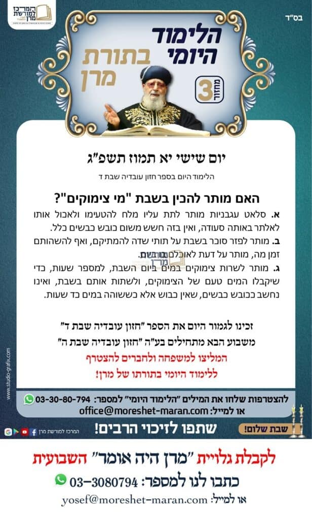 היום נלמד הלכות האם מותר להכין בשבת "מי צימוקים"? א. סלאט עגבניות מותר לתת עליו מלח להטעימו ולאכול אותו לאלתר באותה סעודה, ואין בזה חשש משום כובש כבשים כלל. ב. מותר לפזר סוכר בשבת על תותי שדה להמתיקם, ואף להשהותם זמן מה, מותר על דעת לאוכלם בו ביום. ג. מותר לשרות צימוקים במים ביום השבת, […]