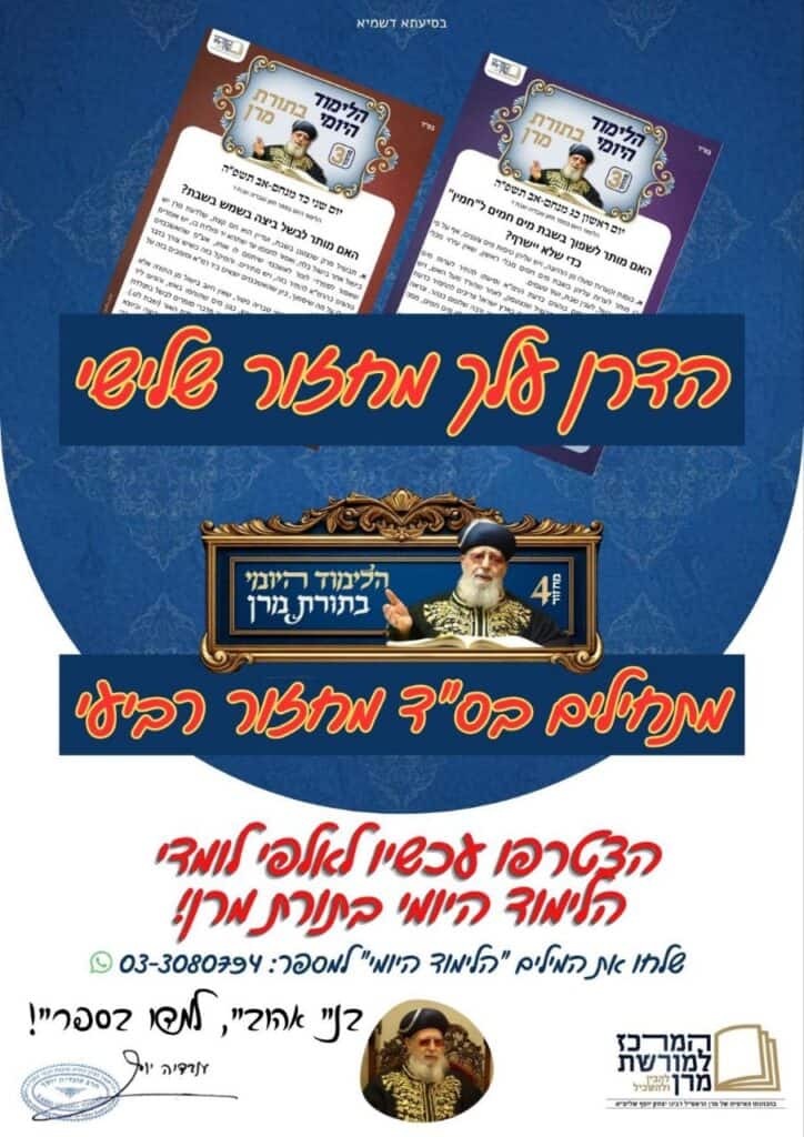 >> חיתמו הוראת קבע להחזקת האתר! יום ראשון הקרוב בס"ד מתחילים מחזור רביעי לימוד קצר של דקות ספורות ביום יהפכו אותך לבקי בהלכה! זה הזמן להיות חלק מהזכות הגדולה – להמשיך את הפצת תורתו של מרן זיע״א! שתפו את ההזדמנות עם חברים ובני משפחה, שיצטרפו גם ללימוד היומי בתורת מרן שתפו את הקישור להצטרפות לרשימת […]
