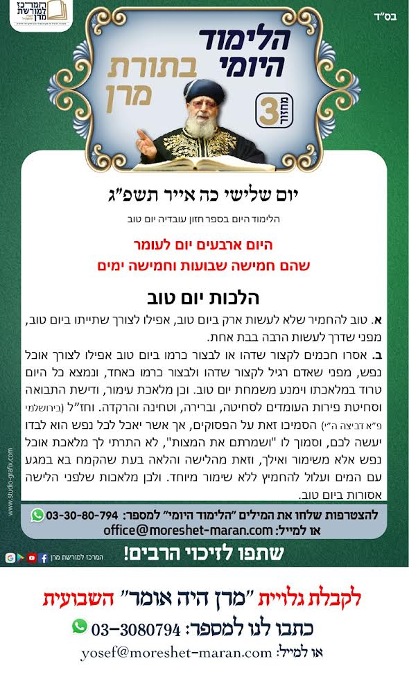היום נלמד הלכות יום טוב א. שחיטת בהמות אף על פי שהיא צורך אוכל נפש ומותרת ביום טוב מעיקר ההלכה, המנהג בזמן הזה ברוב תפוצות ישראל שלא לשחוט שום בהמה ביום טוב. וכן ראוי להנהיג בכל מקום, מפני ריבוי התקלות הנגרמות על ידי זה בשיווק הבשר ובמכירתו, שבאים לידי חילול יום טוב. ובפרט שבזמן הזה […]