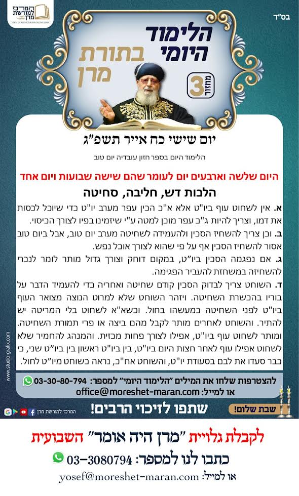 היום נלמד הלכות יום טוב א. שחיטת עופות ביום טוב מותרת גם בזמן הזה, ואפילו כשחל יו"ט אחר השבת [ויש נוהגים להחמיר ביו"ט של ר"ה], ובלבד שיהיו עופות המוכנים לאכילה. ב. תרנגולת העומדת להטיל ביצים או לדגירה אסור לשוחטה ביום טוב מבלי שיזמין אותה לשחיטה מערב יו"ט. ולכן תרנגולות המטילות שמצויות במשקי הלול השונים אסור […]