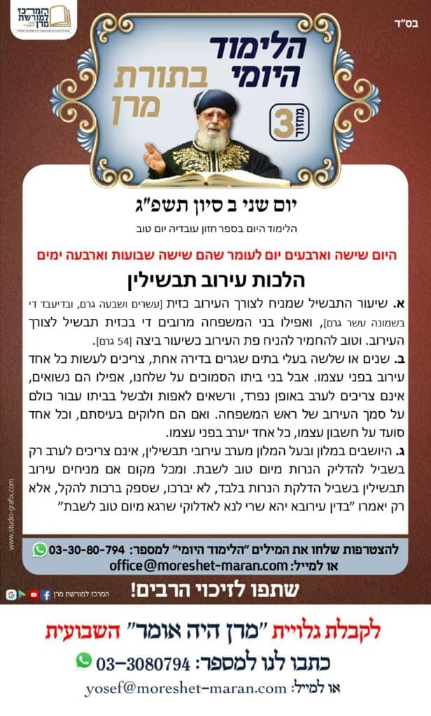 היום נלמד הלכות עירוב תבשילין א. שיעור התבשיל שמניח לצורך העירוב כזית [עשרים ושבעה גרם, ובדיעבד די בשמונה עשר גרם], ואפילו בני המשפחה מרובים די בכזית תבשיל לצורך העירוב. וטוב להחמיר להניח פת העירוב כשיעור ביצה [54 גרם]. ב. שנים או שלשה בעלי בתים שגרים בדירה אחת, צריכים לעשות כל אחד עירוב בפני עצמו. אבל […]