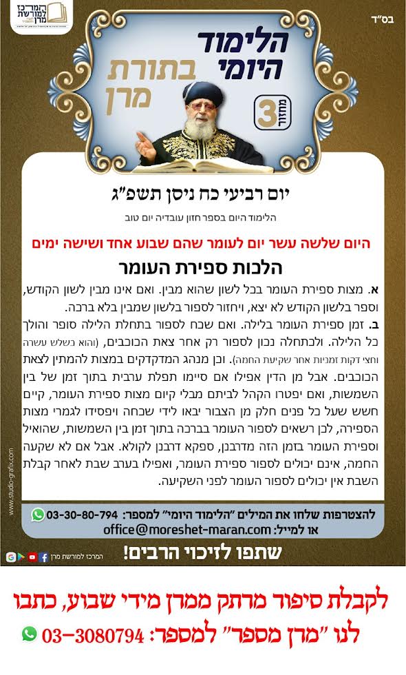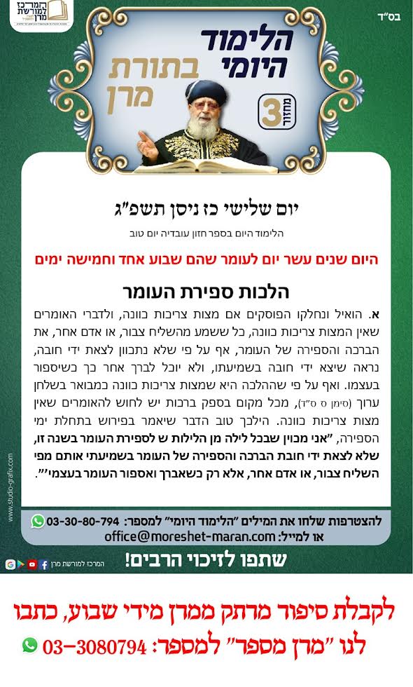 הלימוד היומי בתורת מרן | יום השישי כ"ג בניסן ה'תשפ"ג