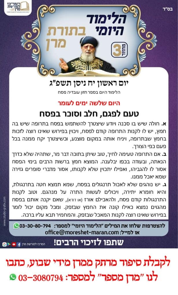 היום נלמד הלכות טעם לפגם. חלב וסוכר בפסח א. חולה שיש בו סכנה ויודע שיצטרך להשתמש בפסח בתרופה שיש בה חמץ, יש לו לקנות התרופה קודם לפסח, ויכוין בפירוש שאינו רוצה לזכות בחמץ שבתרופה, ויניח אותה במקום מוצנע, וכשיצטרך יקח ממנה בכל פעם כפי הצורך. ב. אם התרופה טעימה לחיך, טוב שיתן בתוכה דבר מר, […]