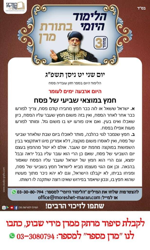 היום נלמד הלכות חמץ במוצאי שביעי של פסח א. ישראל ששאל או לוה ככר חמץ מחבירו קודם פסח, צריך לפורעו ככר אחר לאחר הפסח, ואין בזה משום חמץ שעבר עליו הפסח, כיון שאכלו ואינו בעין. ואם אינו פורעו יש בו משום גזל. ומותר לפורעו מעות אפילו בפסח. ב. חמץ שנמכר לגוי כהלכה, מותר לאוכלו ביום […]