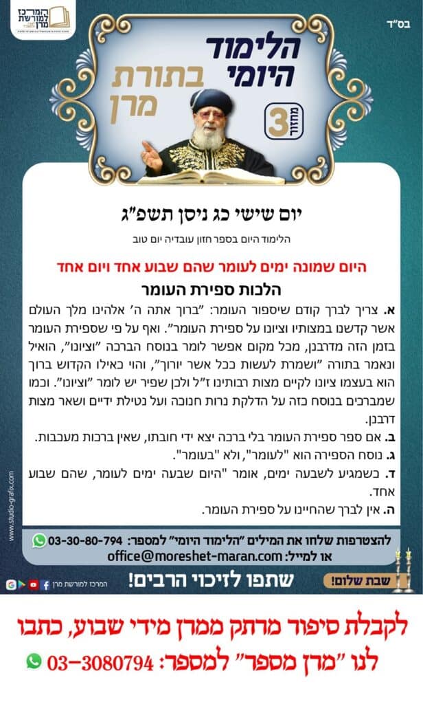היום נלמד הלכות ספירת העומר א. מצות ספירת העומר מעומד, וסמכו חז״ל דין זה על הנאמר (בפרשת ראה טז, ט) ״מהחל חרמש בקמה תחל לספור שבעה שבועות״, אל תקרי בקמה אלא בקומה. ומכל מקום אם מנה מיושב יצא. ב. זקן או חולה שקשה להם לעמוד רשאים לספור העומר לכתחלה כשהם יושבים, שכל שעת הדחק כדיעבד […]