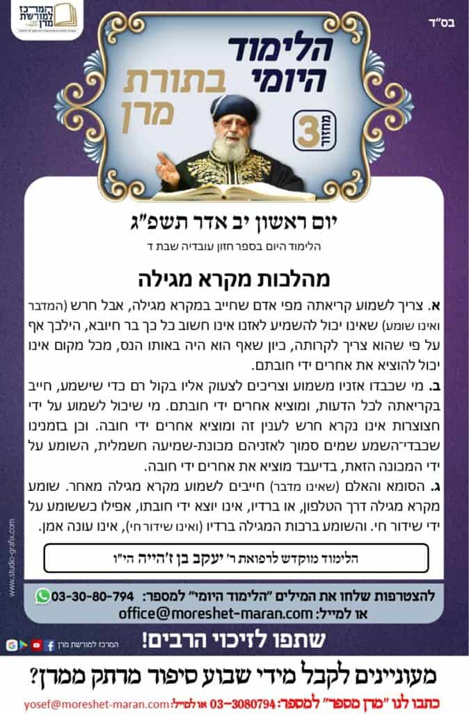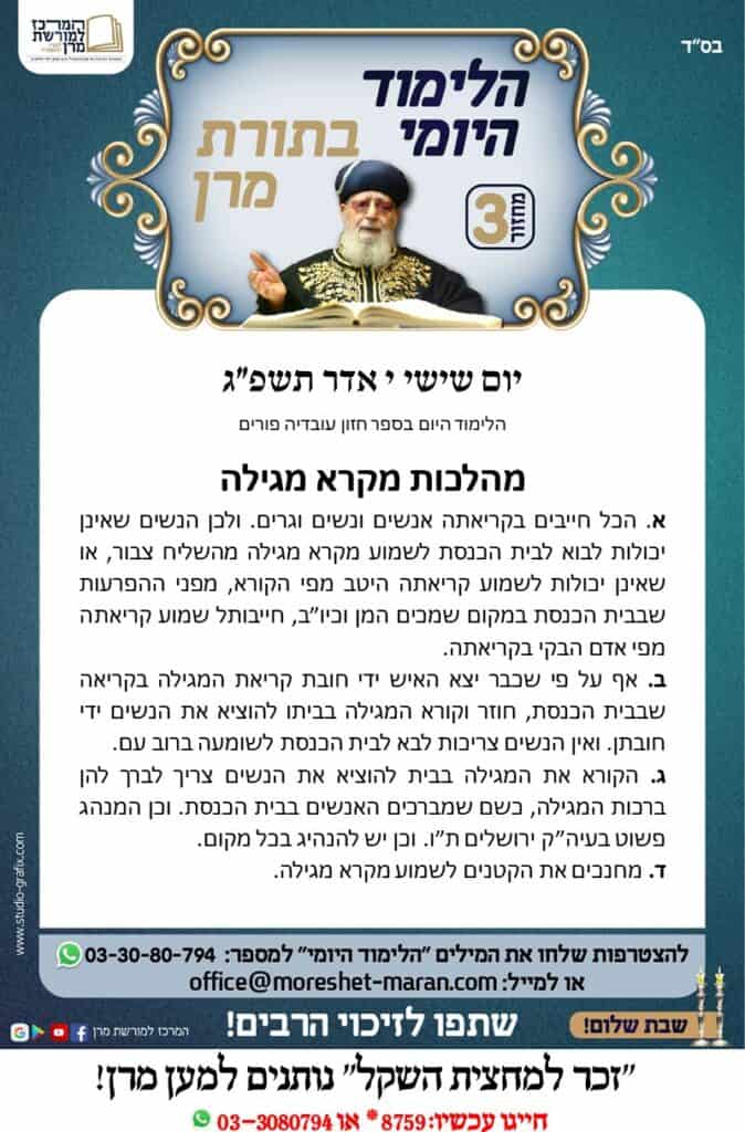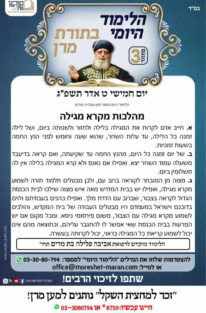 היום נלמד הלכות ארבע פרשיות א. חייב אדם לקרות את המגילה בלילה ולחזור ולשנותה ביום, ושל לילה זמנה כל הלילה, עד עלות השחר, שהוא שעה וחומש לפני הנץ החמה בשעות זמניות. ב. של יום זמנה כל היום, מהנץ החמה עד שקיעתה, ואם קראה בדיעבד משעלה עמוד השחר יצא. ואפילו אם נאנס ולא קרא המגילה בלילה […]