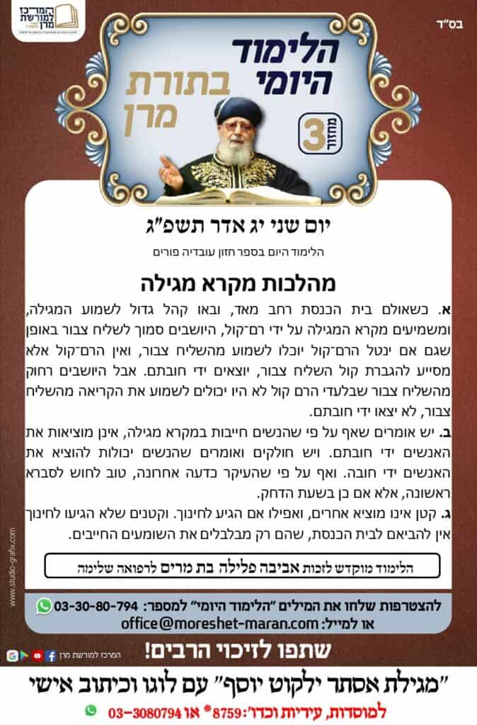 היום נלמד הלכות מגילה א. בכרכים המוקפים חומה מימות יהושע בן נון, אף על פי שאינם מוקפים חומה עכשיו, קוראים את המגילה בט״ו באדר. וכן כפרים הנראים עמהם, אפילו אינם סמוכים להם, כגון שהכפרים בראש ההר, או אם סמוכים להם בתוך מיל (שהוא אלפים אמה מהבית האחרון שבכרך, והשיעור הוא: 960 מטר). אף על פי […]