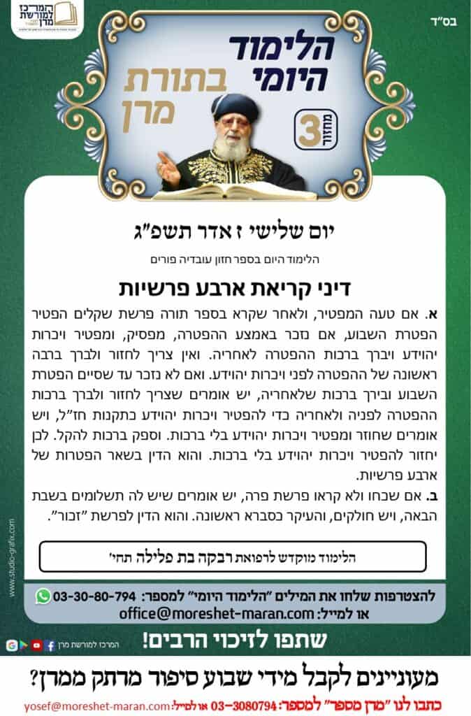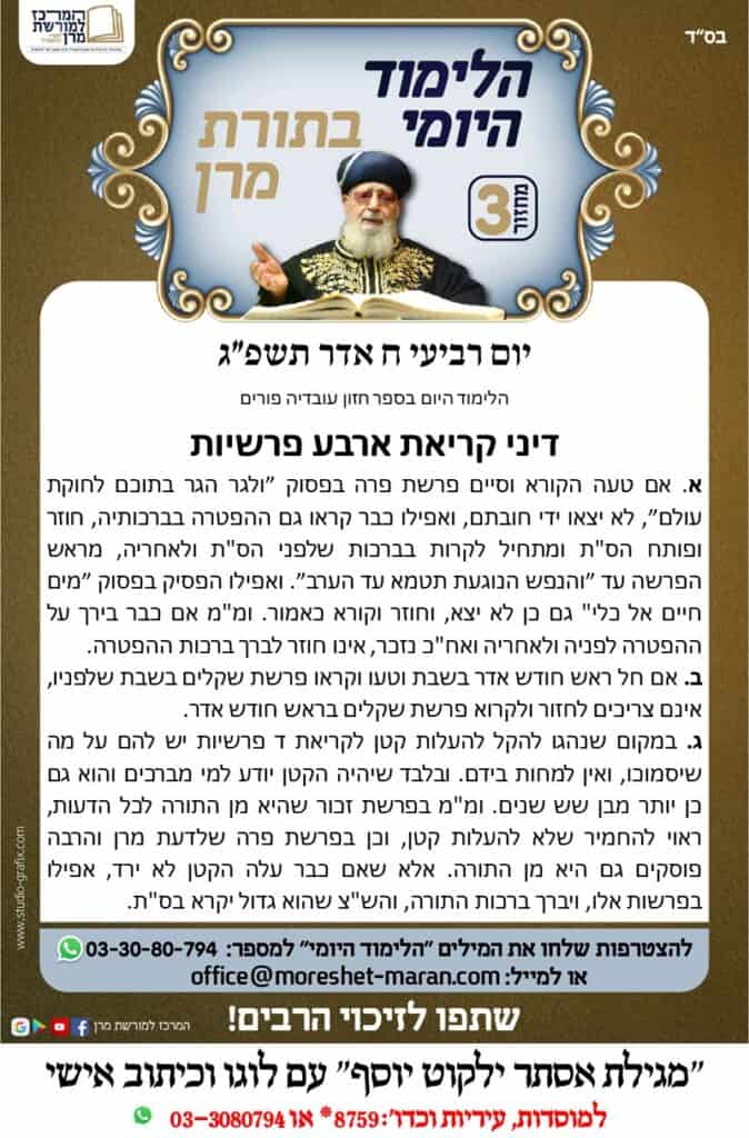 היום נלמד הלכות ארבע פרשיות א. אם טעה והתחיל לקרות אחר פרשת השבוע בפרשת החודש, יגמור ויאמר קדיש, והמפטיר יקרא בספר השלישי פרשת ר"ח, ויפטיר ״השמים כסאי״. ב. לעולם אין להפסיק בין פרשת פרה לפרשת החודש, ואם יש שבת בינתים מפסיקים רק בין קריאת שקלים לזכור, ובין זכור לפרה. ג. אם טעו וקראו סדר ארבע […]