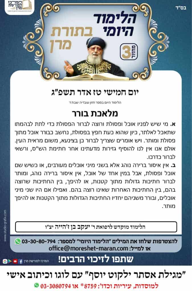 היום נלמד הלכות בורר א. מי שיש לפניו אוכל ופסולת ורוצה לברור הפסולת כדי לתת לבהמתו שתאכל לאלתר, כיון שהוא כעת חפץ בפסולת, נחשב כבורר אוכל מתוך פסולת ומותר. ויש אומרים שצריך לברור כן בצינעא, משום מראית העין. אולם אנו אין לנו להוסיף גזירות מדעתינו אחר חתימת הש"ס, ורשאי לברור כדרכו. ב. אין איסור ברירה […]