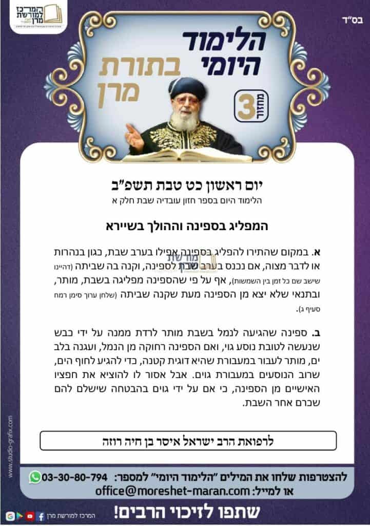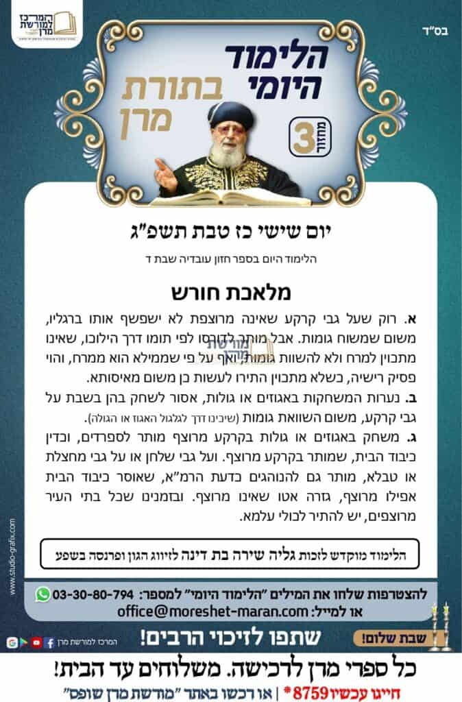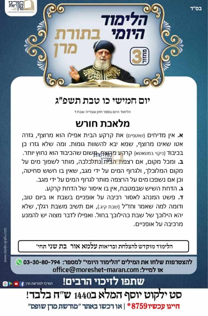 היום נלמד הלכות מלאכת זורע א. אין מדיחים (שוטפים) את קרקע הבית אפילו הוא מרוצף, גזרה אטו שאינו מרוצף, שמא יבא להשוות גומות. ומה שלא גזרו כן בכיבוד (ניקוי במטאטא) קרקע מרוצף, משום שהכיבוד הוא נחוץ יותר. ב. ומכל מקום, אם רצפת הבית נתלכלכה, מותר לשפוך מים על מקום המלוכלך, ולגרוף המים על ידי מגב, […]