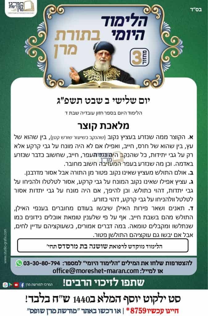 היום נלמד הלכות מלאכת קוצר א. הקוצר ממה שנזרע בעציץ נקוב (שהנקב כשיעור שורש קטן), בין שהוא של עץ, בין שהוא של חרס, חייב, ואפילו אם לא היה מונח על גבי קרקע אלא רק על גבי יתידות, כל שהנקב היה נגד העפר, חייב, שחשוב כדבר שנזרע באדמה. וכן מה שנזרע בעפר המעזיבה חשוב מחובר. ב. […]
