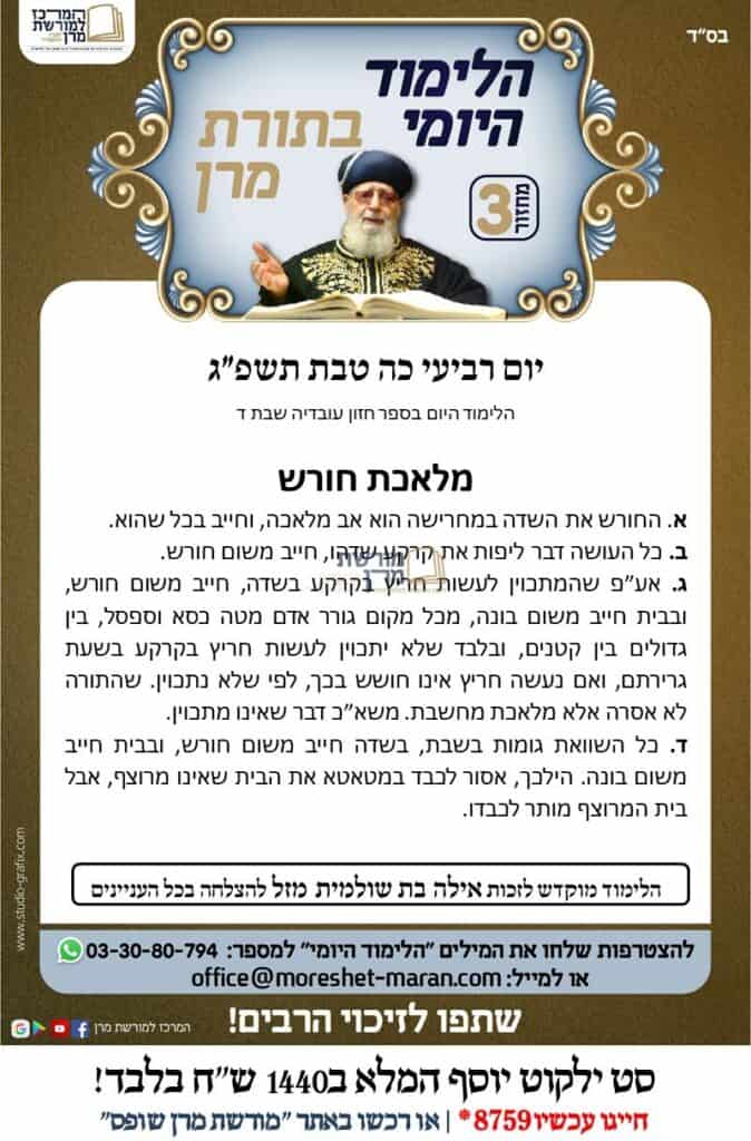 הלימוד היומי בתורת מרן | יום חמישי כ"ו בטבת ה'תשפ"ג