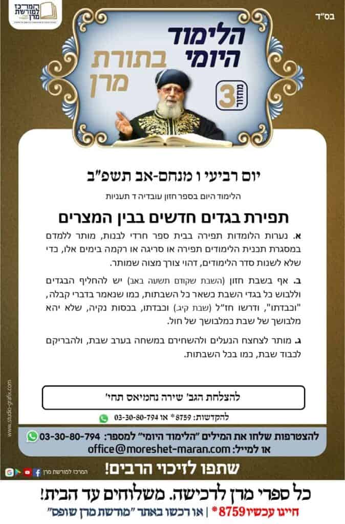 היום נלמד הלכות דיני ומנהגי בין המצרים א. אסור לתפור בגדים חדשים בימים אלו, וכן לתפור נעלים חדשות. ואומן שפרנסתו בכך יש להתיר לו עד שבוע שחל בו ט באב. ב. אסור לנשים לרקום רקמה, וכן לסרוג. ג. מותר לתפור טלאי על בגד ישן שנקרע. וכן מותר לתפור כפתורים שנפלו מן הבגד. ד. בעל בית […]