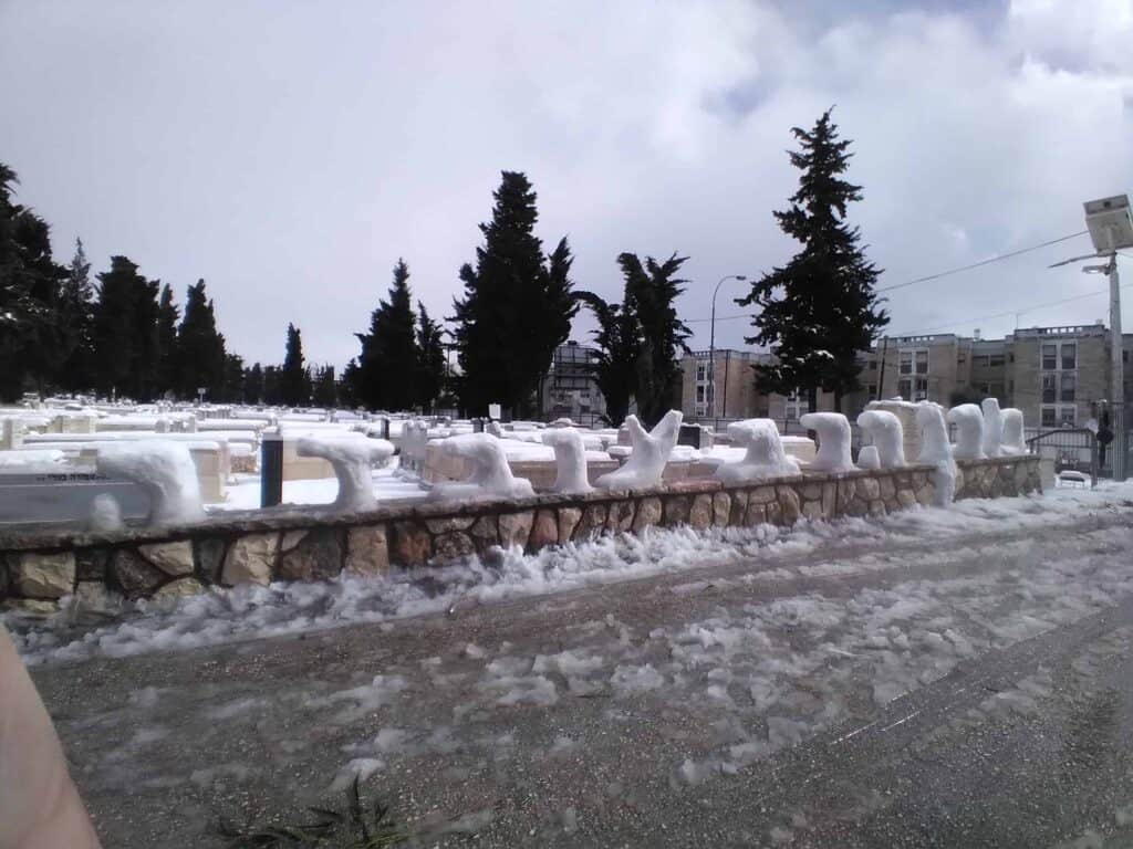 שלג בירושלים: כיתוב באותיות משלג "מרן הרב עובדיה" סמוך לציונו