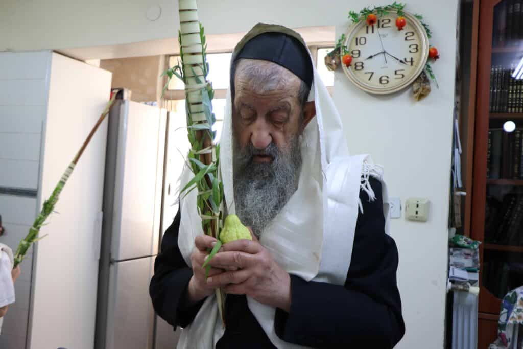 מורנו הגאון חכם בן ציון מוצפי מנענע בלולב בתפילת שחרית הבוקר צילום דוד ארזני