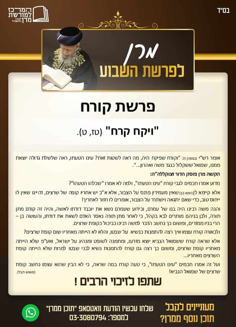 השבוע בפרשת קורח מפרש מרן את הפסוק "ויקח קרח בן יצהר בן קהת בן לוי ודתן ואבירם בני אליאב ואון בן פלת בני ראובן" (במדבר ט"ז א')