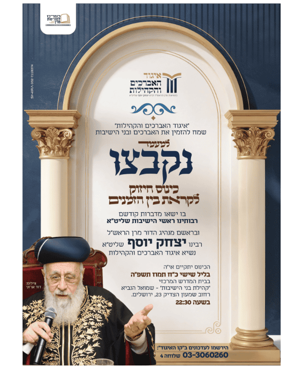 התרגשות רבה בקרב ציבור בני התורה והאברכים לקראת המעמד הגדול 'נקבצו' ביוזמת 'איגוד האברכים והקהילות' הפועל לחיזוק יסודות התורה בקרב ציבור בני הישיבות והאברכים בארה"ק.