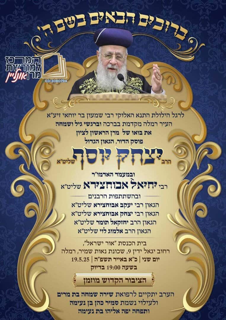 הערב נערך מעמד מרגש ומרומם של הילולת התנא האלוקי רבי שמעון בר יוחאי זיע״א בעיר רמלה, במעמד מרן מנהיג הדור שליט״א, רב העיר הגאון רבי יחיאל אבוחצירא שליט״א, ראש העיר מר מיכאל וידל, רבני העיר, אישי ציבור, ומאות מתושבי העיר שנהרו בהמוניהם להשתתף במעמד המרומם.