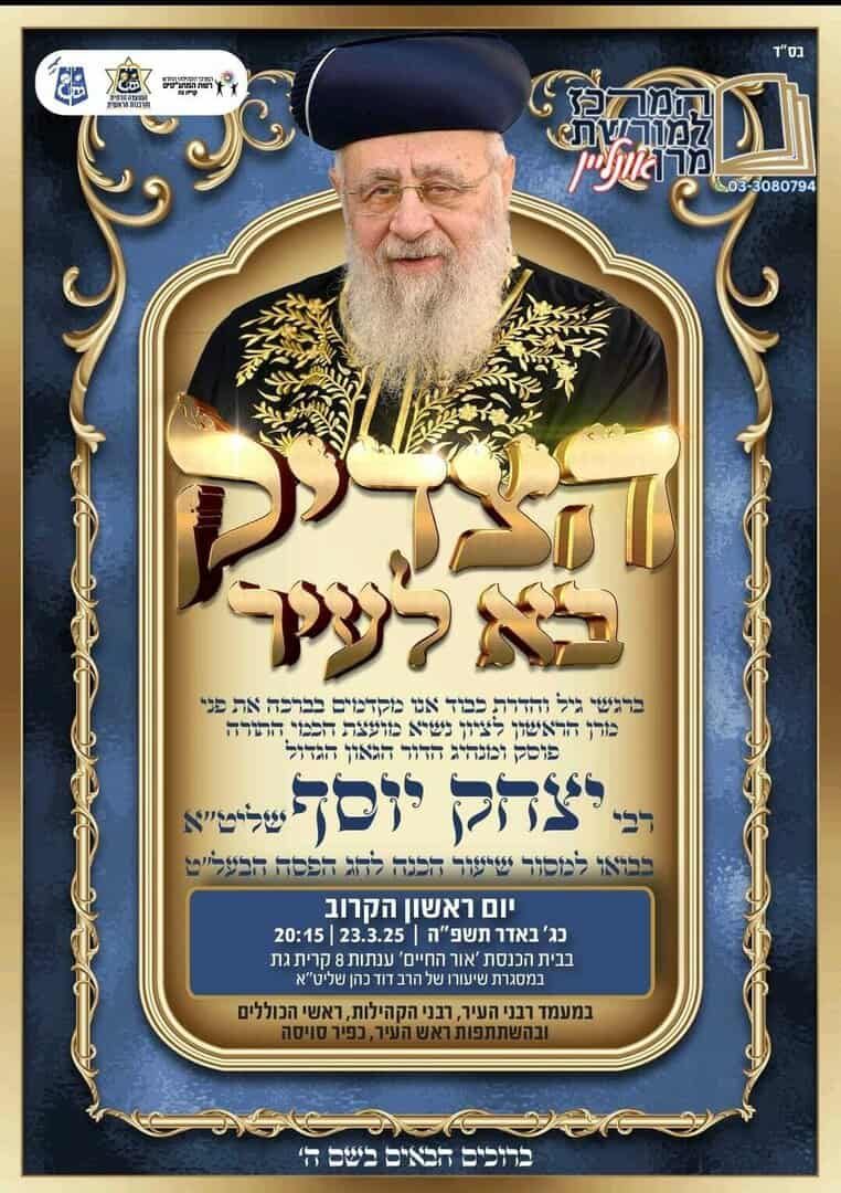 בשורה משמחת לציבור בני התורה בעיר קריית גת, בהתרגשות ובשמחה רבה, הציבור הקדוש מוזמן להשתתף בכינוס תורני נשגב ומרומם, לקראת חג הפסח הבעל"ט, במעמד מנהיג הדור מרן הראשון לציון רבנו יצחק יוסף שליט"א.