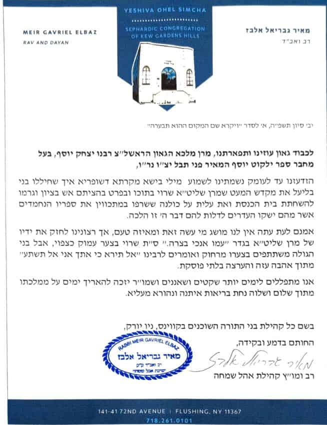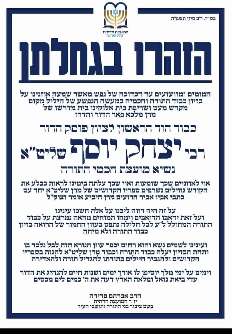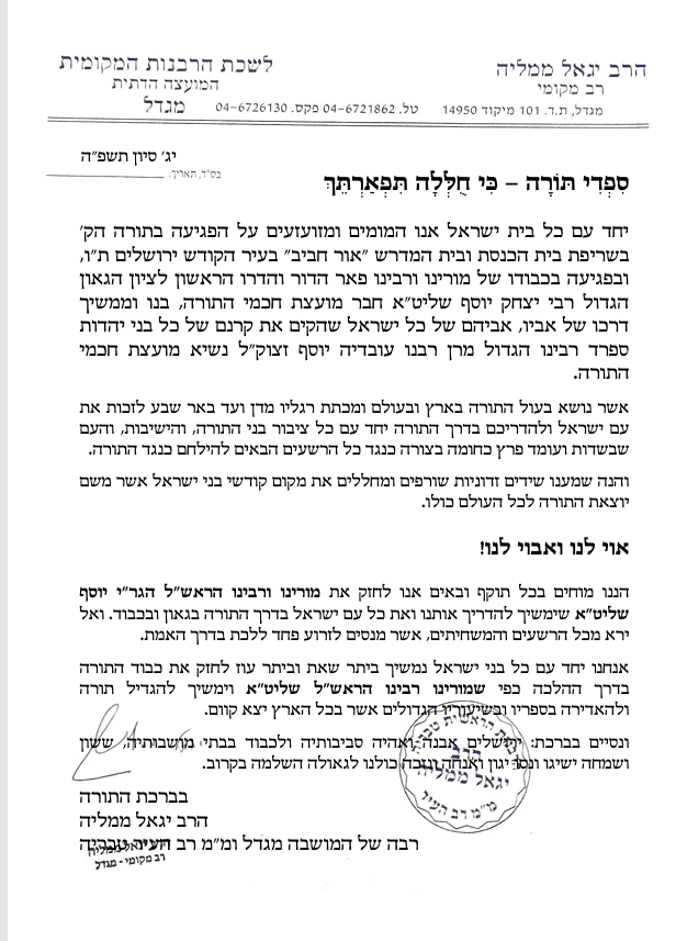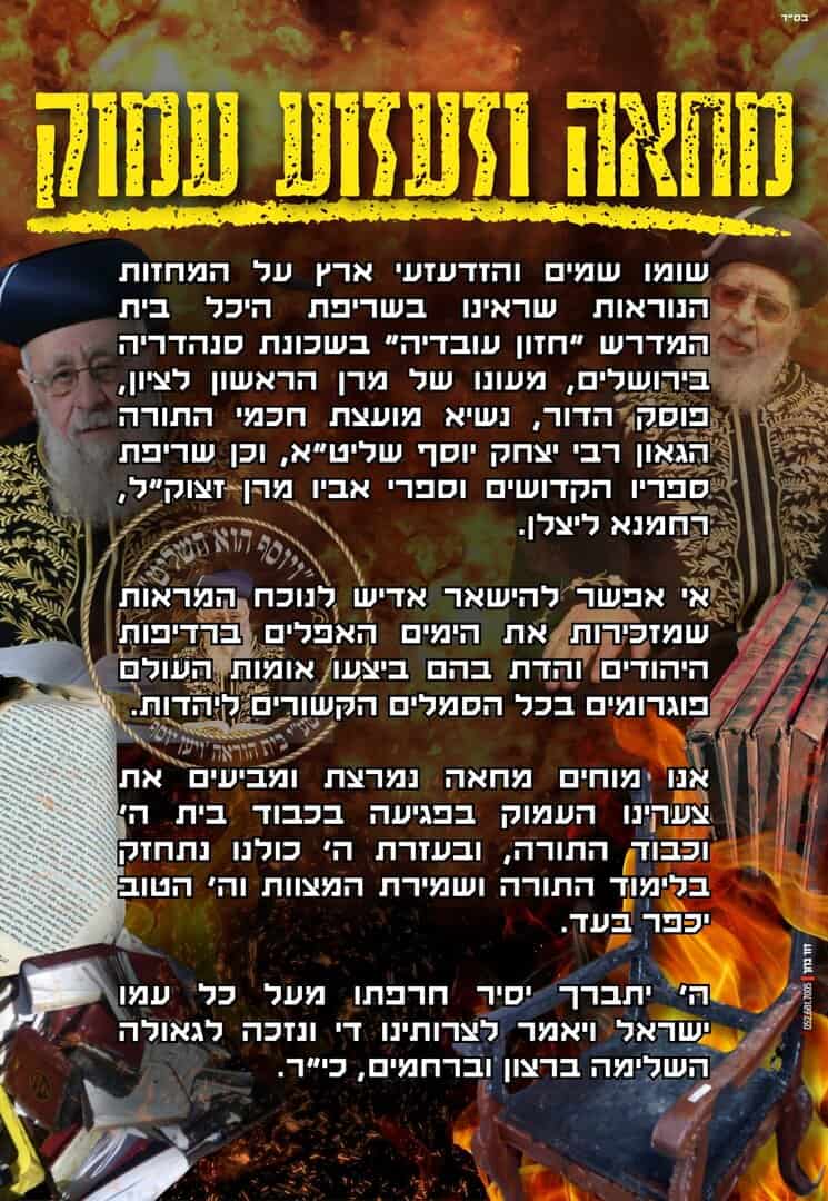 לאחר ההצתה המזעזעת בבית המדרש של מנהיג הדור מרן הראש"ל רבנו יצחק יוסף שליט״א, רבנים, דיינים, והנהגות רוחניות מכל רחבי הארץ והעולם מגיבים בגל מכתבי גינוי חריפים לצד מכתבי תמיכה.