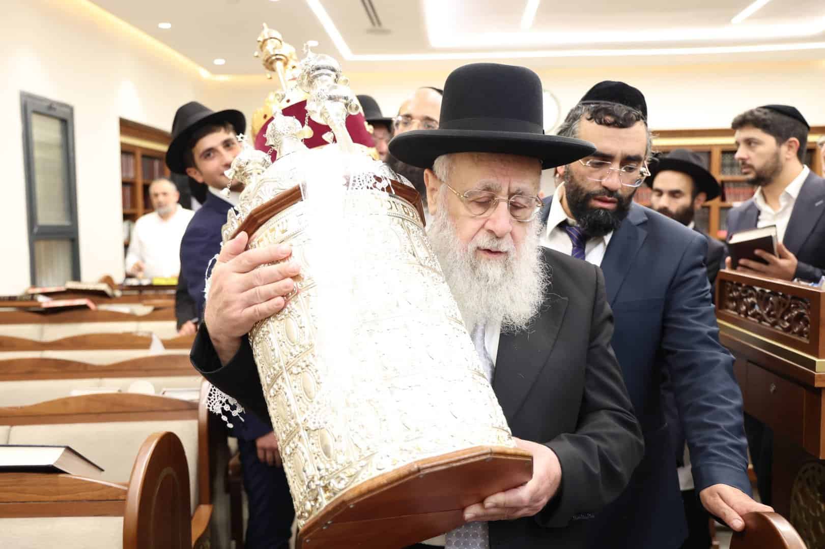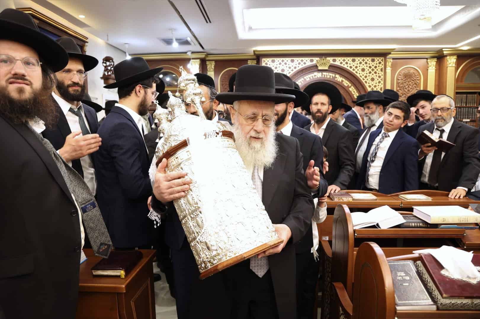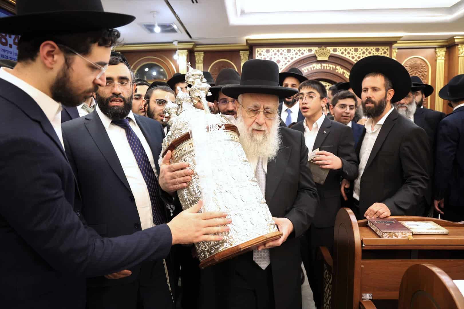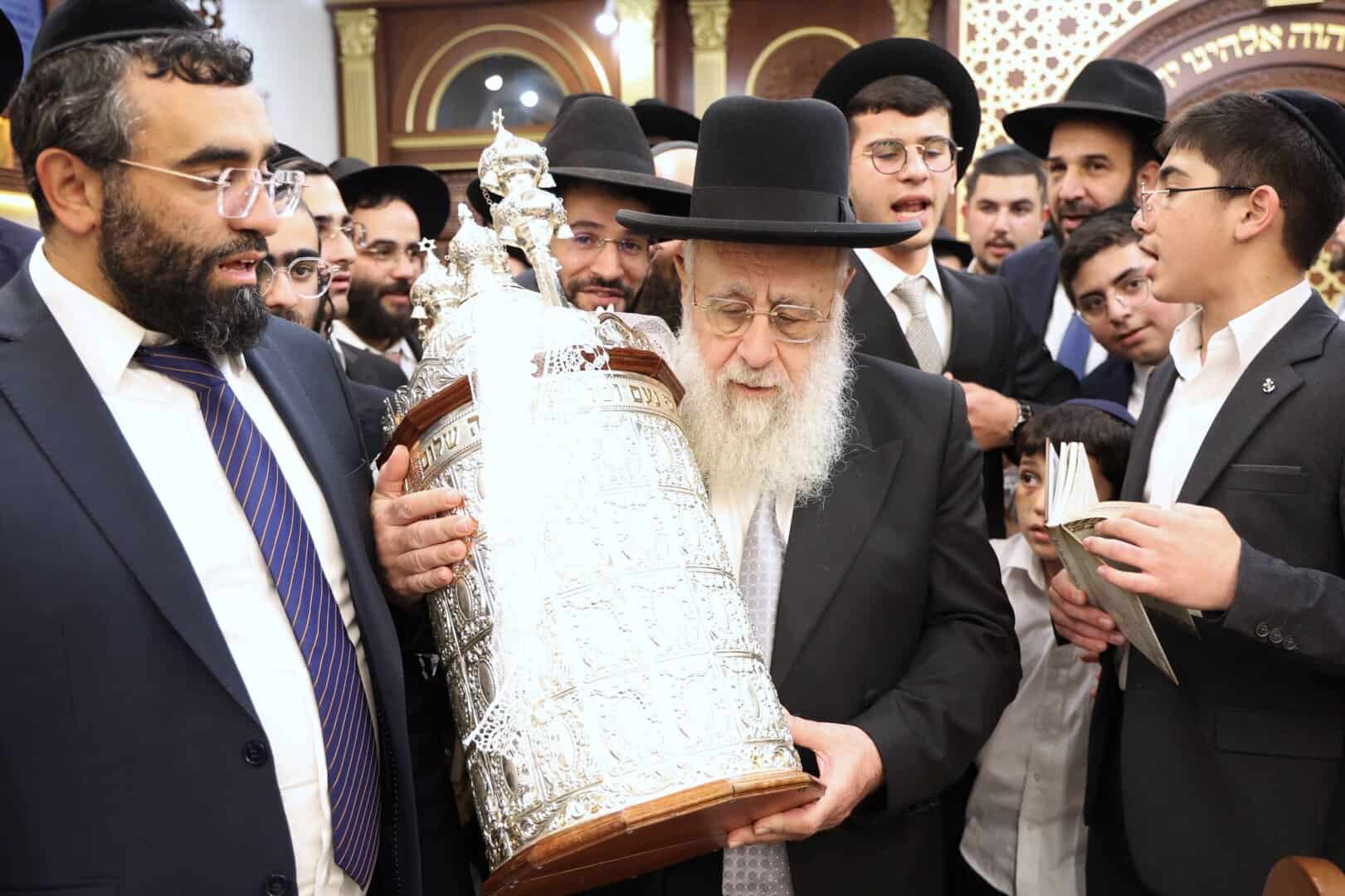 לאחר התפילות וההקפות המרוממות שנערכו בבית מדרשו ׳אור חביב׳,יצא מנהיג הדור מרן הראשון לציון רבנו יצחק יוסף שליט״א להשתתף בהקפות של תפילת מנחה בשמחה של מצווה.