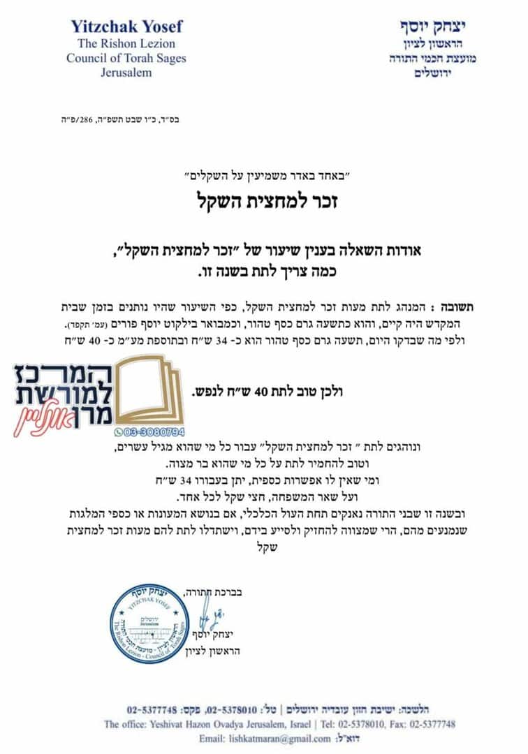 במכתב שהוציא מנהיג הדור מרן הראשון לציון רבנו יצחק יוסף שליט"א, התייחס לסכום "זכר למחצית השקל" אותו יש לתת בשנה זו, שנת תשפ"ה 2025.