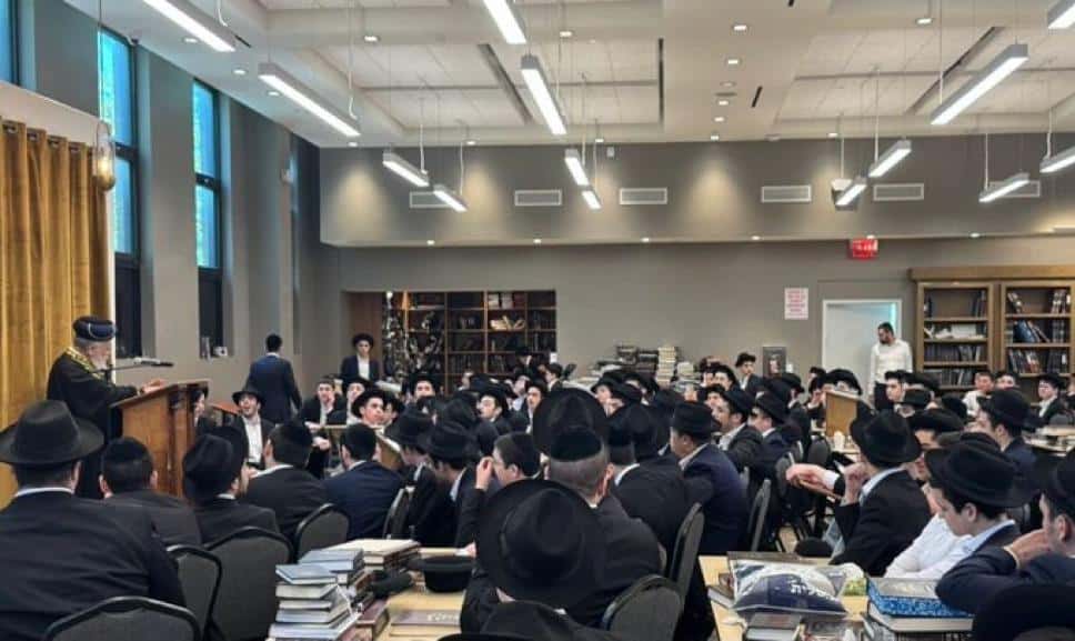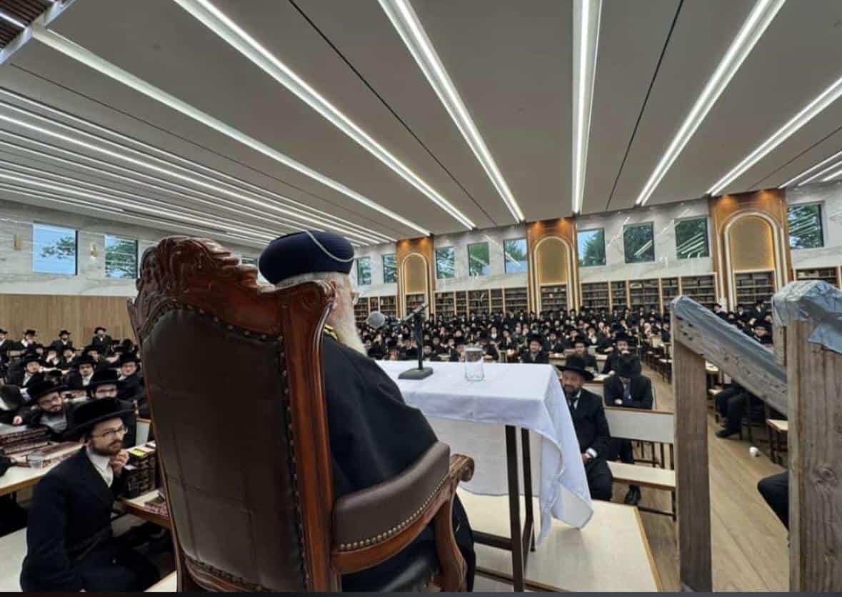מרן מנהיג הדור שליט״א בשיעור בבית המדרש המרכזי של חסידי בעלזא בשכונת בורו פארק בהשתתפות מאות אברכי הקהילה.