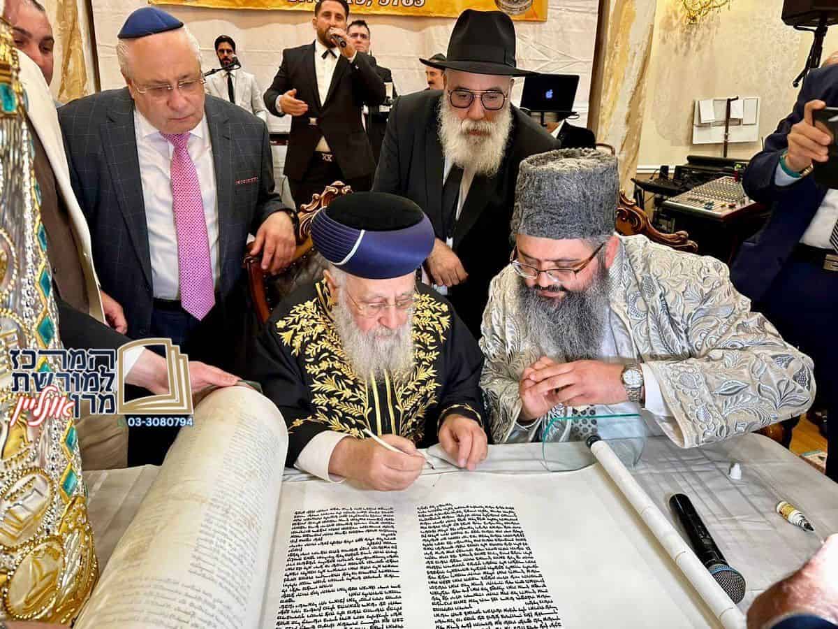 מרן מנהיג הדור שליט"א בכתיבת אות בס"ת שנכתב להצלחת כוחות הביטחון ע"י הקהילה הבוכרית בראשות הרב ברוך בבייב שליט"א (מימין).