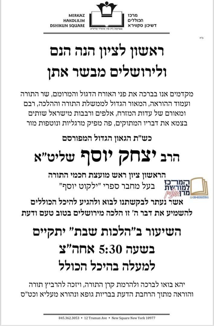 מחר (יום רביעי) יתקיים שיעור עיוני בהלכות שבת לאברכי כולל סקווירא בניו סקווירא מפי מרן מנהיג הדור שליט"א.