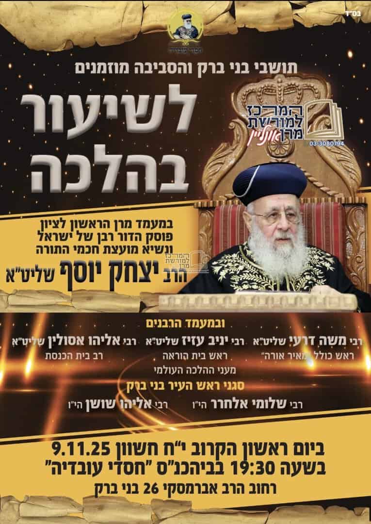 תושבי בני ברק והסביבה מוזמנים להשתתף הערב יום ראשון יח׳ חשוון בשיעור הלכתי מיוחד שיימסר מפי מנהיג הדור מרן הראש״ל רבנו יצחק יוסף שליט״א, בהיכל בית הכנסת “חסדי עובדיה” רחוב אברמסקי 26 שכונת קרית הרצוג, בשעה 19:30, במעמד רב בית הכנסת הרב אליהו אסולין, רבני העיר ואישי ציבור.