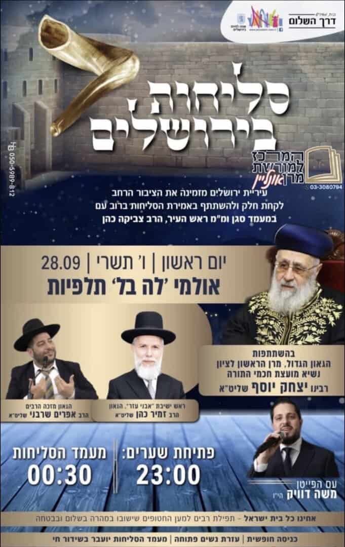 הערב בעיר ירושלים יתקיים מעמד סליחות וכנס חיזוק  מרכזי ביוזמת עיריית ירושלים, בראשות מנהיג הדור מרן הראש״ל רבנו יצחק יוסף שליט״א ובמעמד הגאון הגדול רבי זמיר כהן שליט״א ראש ישיבת אבני נזר והרה״ג רבי אפרים שרבני שליט״א רב קהילת מחנה אפרים בשכונת גילה רבני העיר ואישי ציבור.