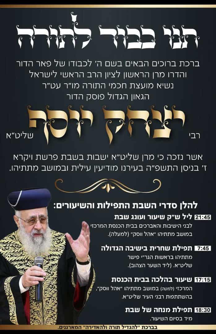 תושבי והסביבה מתתיהו מתרגשים לקראת שבת מיוחדת ונדירה – שבת ויקרא הגדול מוקדם, בה יתארח מנהיג הדור מרן הראשון לציון רבנו יצחק יוסף שליט"א. שבת זו, מביאה עמה הזדמנות נדירה לשאוב מתורתו של אחד מגדולי פוסקי הדור ולחוות חוויית שבת רוחנית ועוצמתית.
