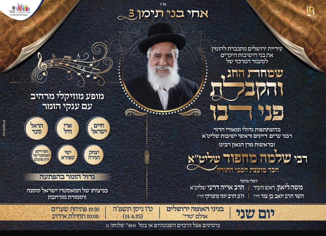 •יום שני א׳ דחוה״מ: בעיר ירושלים מעמד מרכזי ב׳בניני האומה׳ בשעה 19:30 בהשתתפות ראשי ישיבות רבנים ואישי ציבור ובליווי גדולי הזמרים חיים ישראל, יצחק חגירה, ארי היל ועוד.