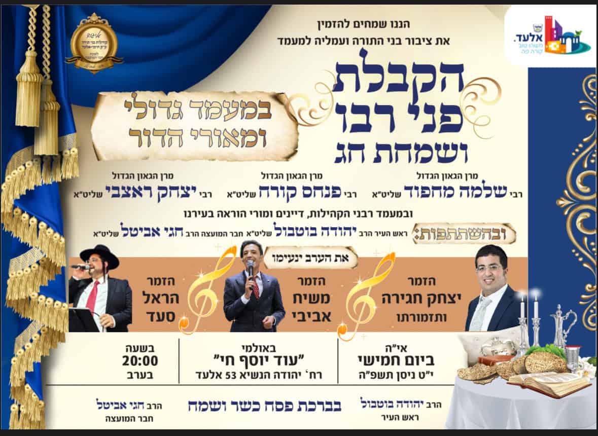 •יום חמישי ד׳ דחוה״מ: בעיר אלעד בבית הכנסת ׳עוד יוסף חי׳ בשעה 20:00 בהשתתפות רבנים ודיינים בליווי הזמר יצחק חגירה ותזמורתו ועוד זמרים.