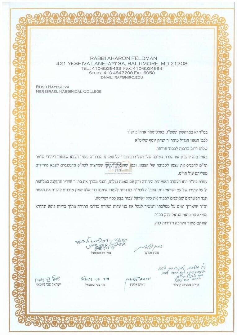 ברקע המצב הקשה השורר ומשבר חוק הגיוס בו בחורי ישיבות נזר הבריאה נלקחים לבית המאסר בעוון לימוד תורה, יצאו גדולי ראשי הישיבות באמריקה ובראשם הג"ר אהרון פלדמן שליט״א ר״י נר ישראל, הג"ר אלי' דב וכטפוגל שליטה ר״י סאוט׳ פלוסברג, והג"ר מלכיאל קוטלר שליט״א ר״י בית מדרש גבוה-לייקווד וכתבו באורח נדיר מכתב חיזוק למרן הראשון לציון פוסק הדור רבינו יצחק יוסף שליט"א המנהיג את ציבור בני התורה הספרדיים בארה״ק, על עמדתו הנחרצת בכל נושאי הגיוס.