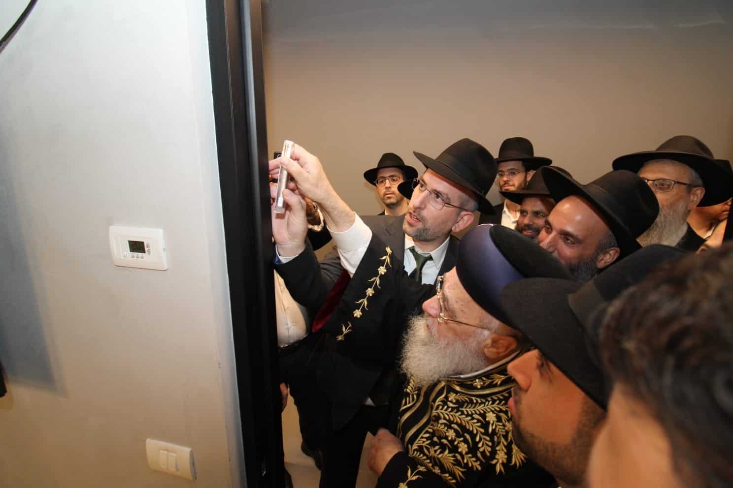 מנהיג הדור מרן הראשון לציון רבנו יצחק יוסף שליט״א בקביעת מזוזה ופתיחת בית ההוראה ׳מענה הלכה׳ בראשות תלמידו הגר״י עזיז שליט״א במשרדים החדשים של ערוץ 2000 אמש (יום שלישי) בעיר בני ברק.