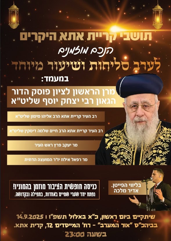 קרית אתא: עצרת חיזוק וסליחות בהשתתפות רבני העיר בליווי הפייטן אדיר מלכה בבית הכנסת ׳אור המערב׳ רחוב המייסדים 12 בשעה 23:00.