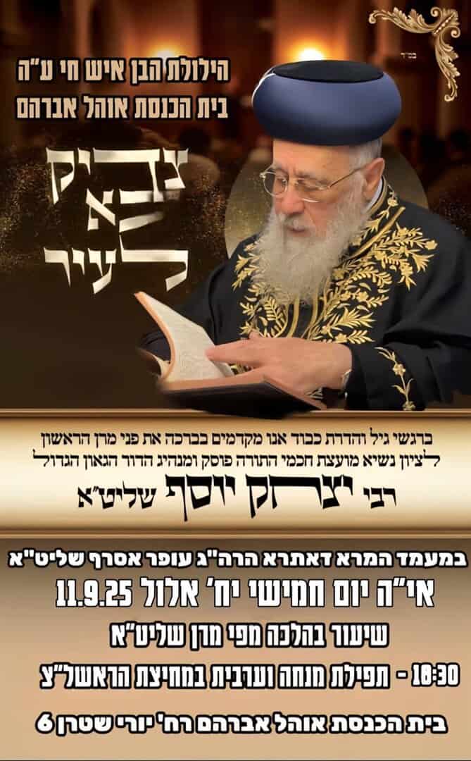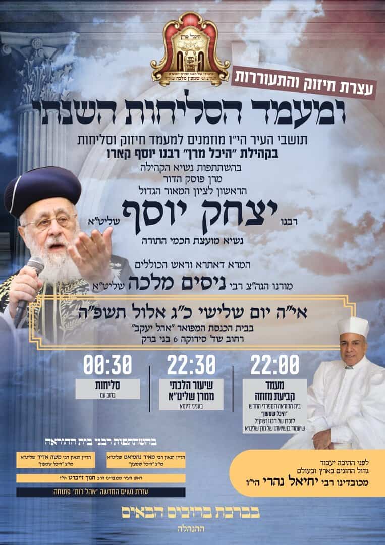 בני ברק: חנוכת בית ההוראה החדש עצרת חיזוק ומעמד הסליחות השנתי ב׳היכל מרן׳ רחוב שד׳ סירוקה 6, תחילת המעמד בשעה 22:00, לפני התיבה יעבור הפייטן יחיאל נהרי.