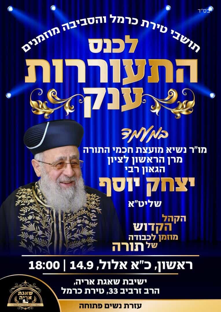טירת הכרמל: ישיבת ׳שאגת אריה׳ רחוב הרב זרביב 33 כנס התעוררות בשעה 18:00.
