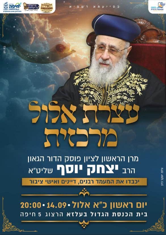 חיפה: עצרת מרכזית בבית המדרש המרכזי של חסידות ׳בעלזא׳ בהשתתפות רבנים דיינים ואישי ציבור, רחוב הרצוג 5 בשעה 20:30.