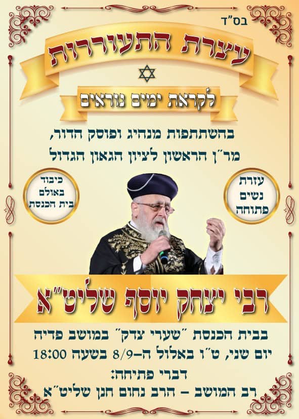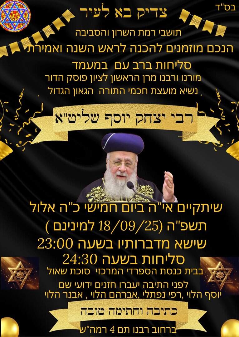 בחודש אלול, חודש הרחמים והסליחות, ייצא מנהיג הדור מרן הראשון לציון רבנו יצחק יוסף שליט״א למסע חיזוק מיוחד ועצרות סליחות בכל רחבי הארץ, לעורר את ליבם של עם ישראל להתחזק בלימוד התורה, בקיום המצוות ובהכנה רוחנית אמיתית לקראת הימים הנוראים.