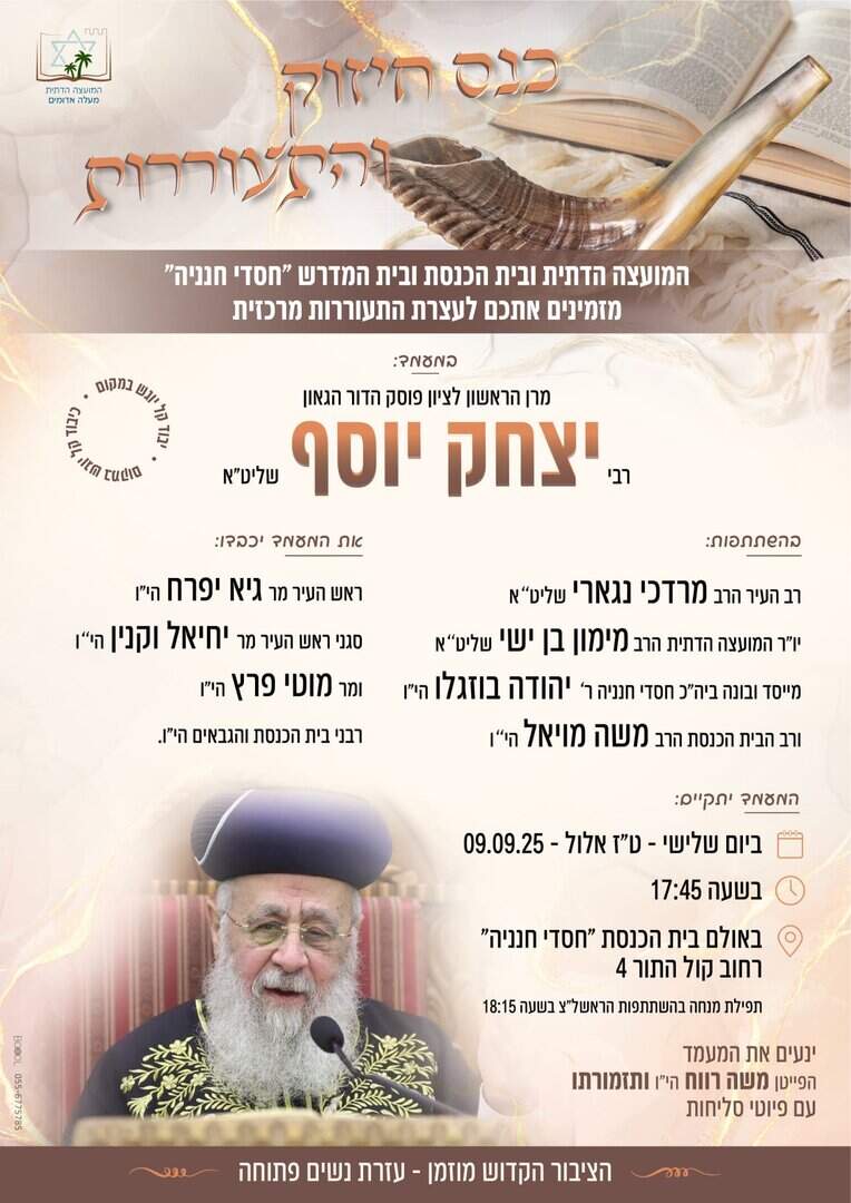 מעלה אדומים: כנס חיזוק והתעוררות בבית המדרש ׳אור חנניה׳ בהשתתפות רבני העיר ואישי ציבור תפילת מנחה בהשתתפות מנהיג הדור שליט״א בשעה 18:15.
