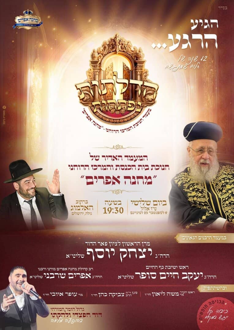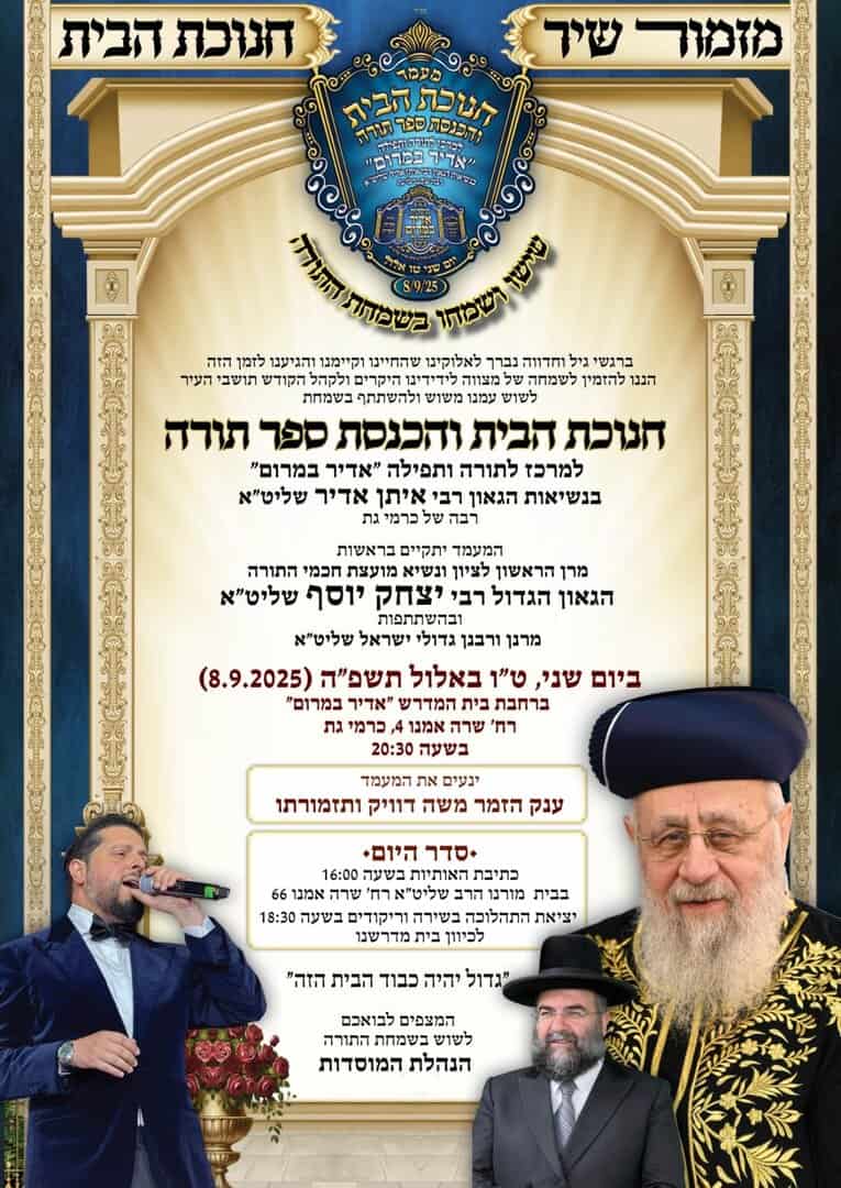 שכונת גילה: חנוכת המרכז הרוחני ׳מחנה אפרים׳ רחוב האלמוג, בהשתתפות ראשי ישיבות רבנים ואישי ציבור בשעה 20:30.