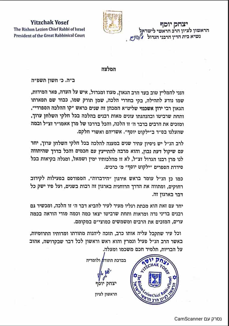 הרב ירון אשכנזי שליט"א מכהן כיו"ר קו ההלכה הספרדי, כזכור בשבת התאחדות של הארגון שנערכה בחודש שבט האחרון, מנהיג הדור מרן הראש"ל רבנו יצחק יוסף שליט"א חבש לרב אשכנזי את הכובע הרבני המכונה 'המבורג' וביקש ממנו ללבוש את הכובע באופן קבוע ובירכו שימשיך לעשות חיל בהעמדת התורה וההלכה.