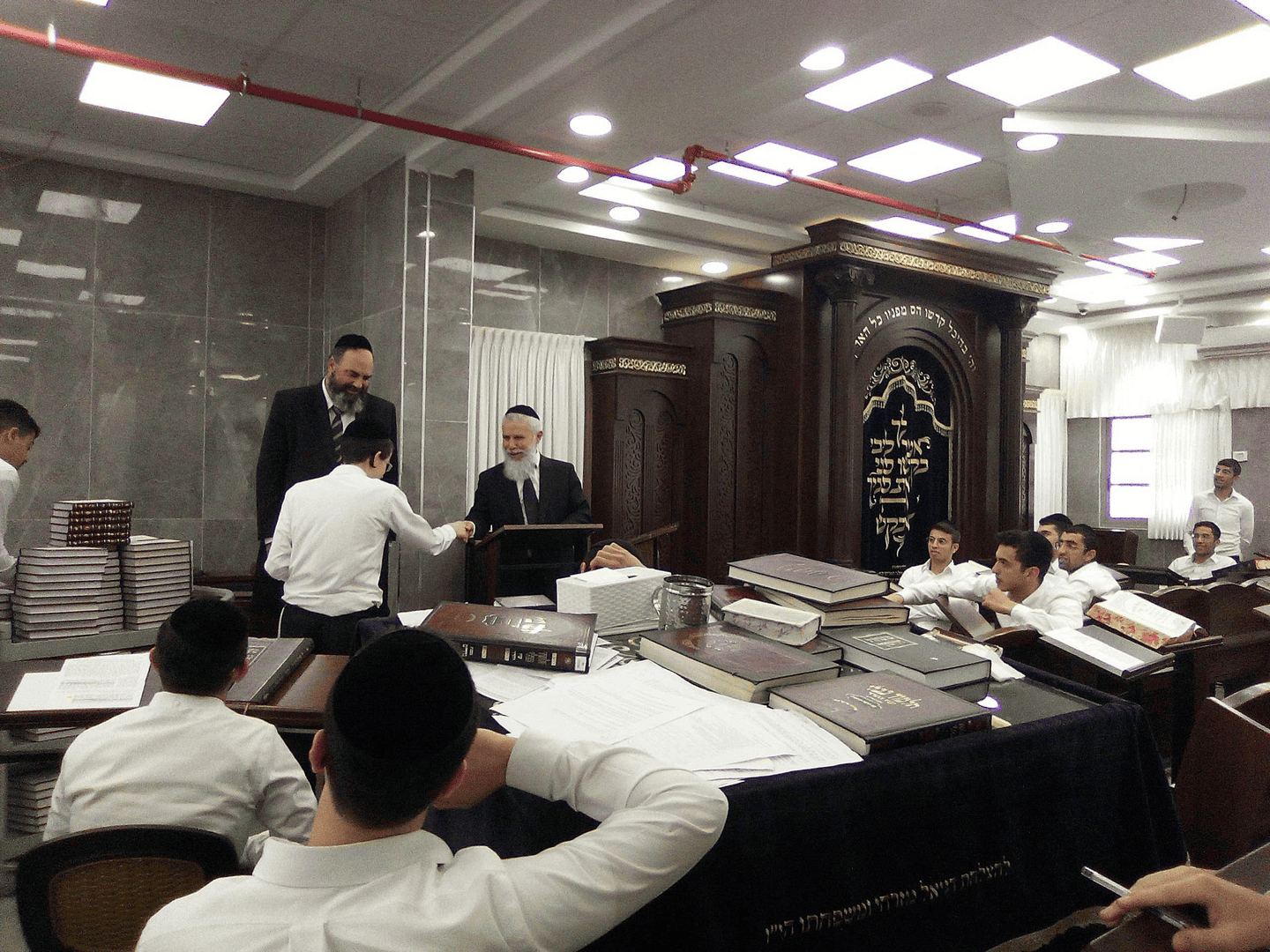 הבחורים קיבלו מראש הישיבה הגאון רבי זמיר כהן שליט"א סט ספרים 'חזון עובדיה – שבת' ו' כרכים למרן רבינו עובדיה יוסף זיע"א מוטבעים בלוגו הישיבה.