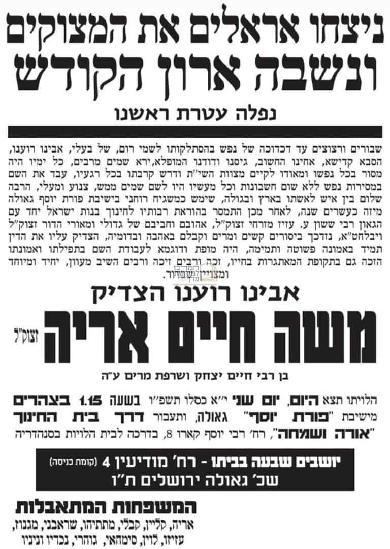 מירושלים מגיעה הבשורה המעציבה על הסתלקותו של הצדיק רבי משה חיים אריה זצ”ל, ראש מוסדות אורה ושמחה, בן 80.