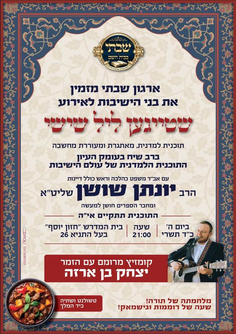 אווירה של התעלות ורוממות צפויה להתקיים היום יום חמישי כד׳ תשרי, כאשר ארגון ׳שבתי׳ המאגד את קהילות בני התורה בעיר יקיים את האירוע המיוחד “שטייגען ליל שישי” ערב שכולו תורה, מחשבה וניגון, המיועד לבני הישיבות המבקשים להעמיק בלימוד ולהתמלא בהשראה.