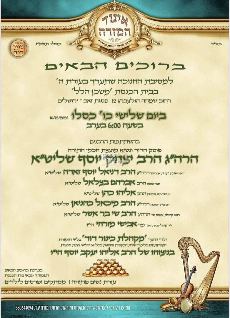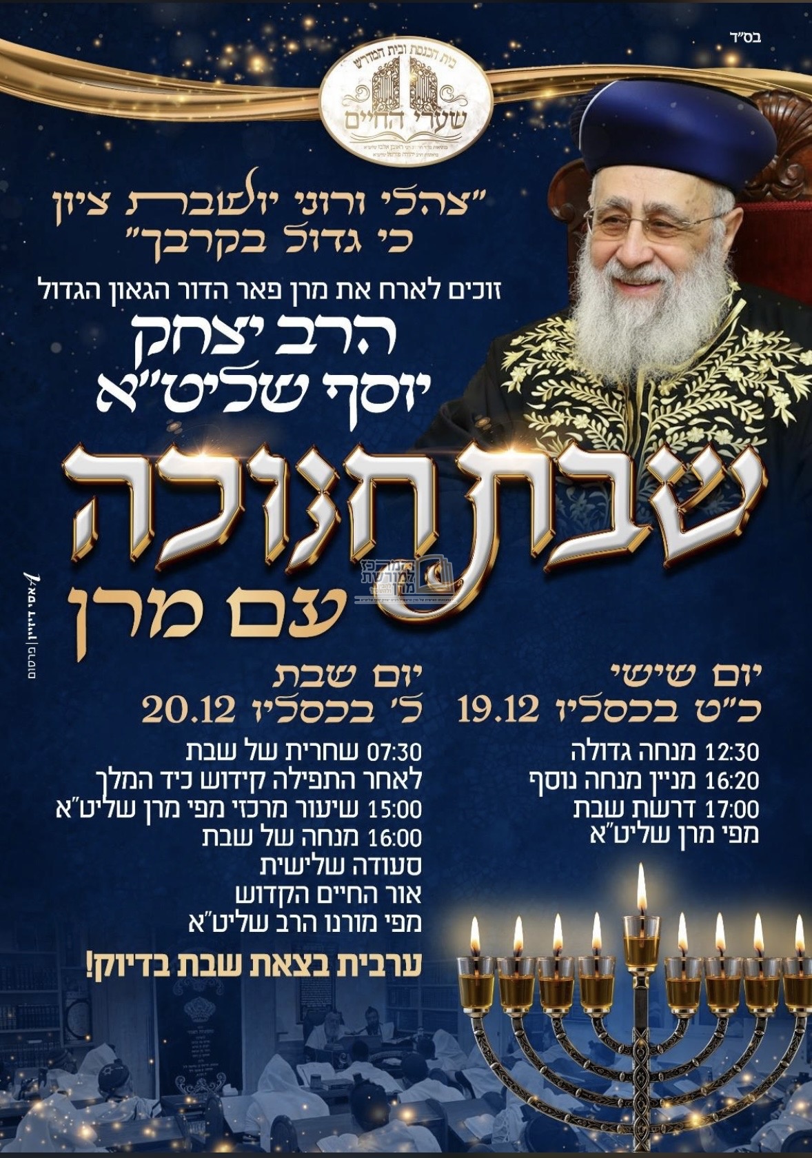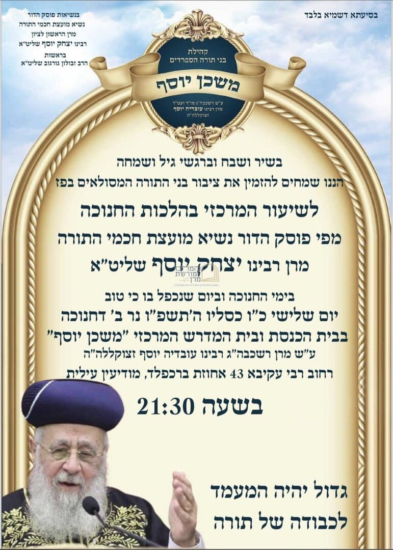 ה׳מרכז למורשת מרן׳ מגיש את כל אירועי וזמני השיעורים והמעמדים בימי חג החנוכה תשפ״ו בצל מנהיג הדור מרן הראש״ל רבנו יצחק יוסף שליט״א ברחבי הארץ.